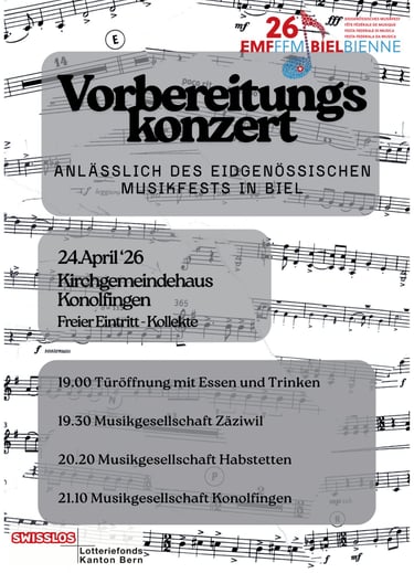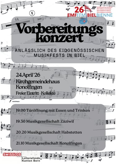 Anlässlich des Eidgenössischen Musikfestes in Biel führen wir zusammen mit der Musikgesellschaft Konolfingen und Habstetten ein Vorbereitungskonzert durch.